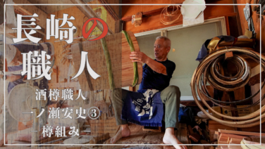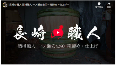諫早の酒蔵・杵の川酒造様のご協力のもと、県内唯一の酒樽職人 一ノ瀬安史さんの作業の様子を取材しました。作業内容にスポットを当てた、アーカイブスを意識した動画です。木材のみで組み上げていく酒樽作り。 第4回は引き続き箍を締め、箍...